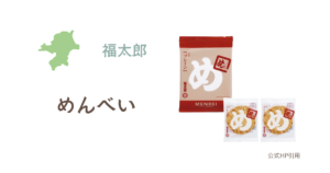 福太郎の代名詞ともなった、明太子のおせんべい「めんべい」。博多土産の新定番として福岡を始め各地で販売されています。パリパリっと何枚でも食べられる食感と、程よい辛味と魚介の旨味が特徴です。